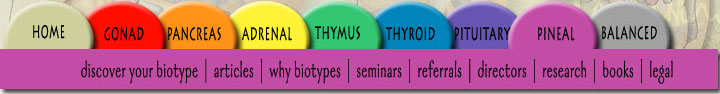 Home | Gonad | Pancreas | Thymus | Thyroid | Pituitary | Pineal | Balanced Copyright Laura Power and Dario Nardi, August 2004. All written material and body type illustrations on this site are the exclusive properly of Laura Power and Dario Nardi. Please contact us for more information. |