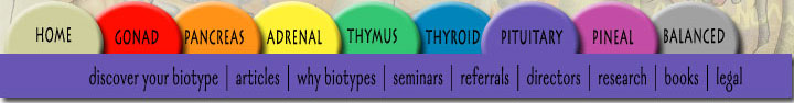 Home | Gonad | Pancreas | Thymus | Thyroid | Pituitary | Pineal | Balanced Copyright Laura Power and Dario Nardi, August 2004. All written material and body type illustrations on this site are the exclusive properly of Laura Power and Dario Nardi. Please contact us for more information. |